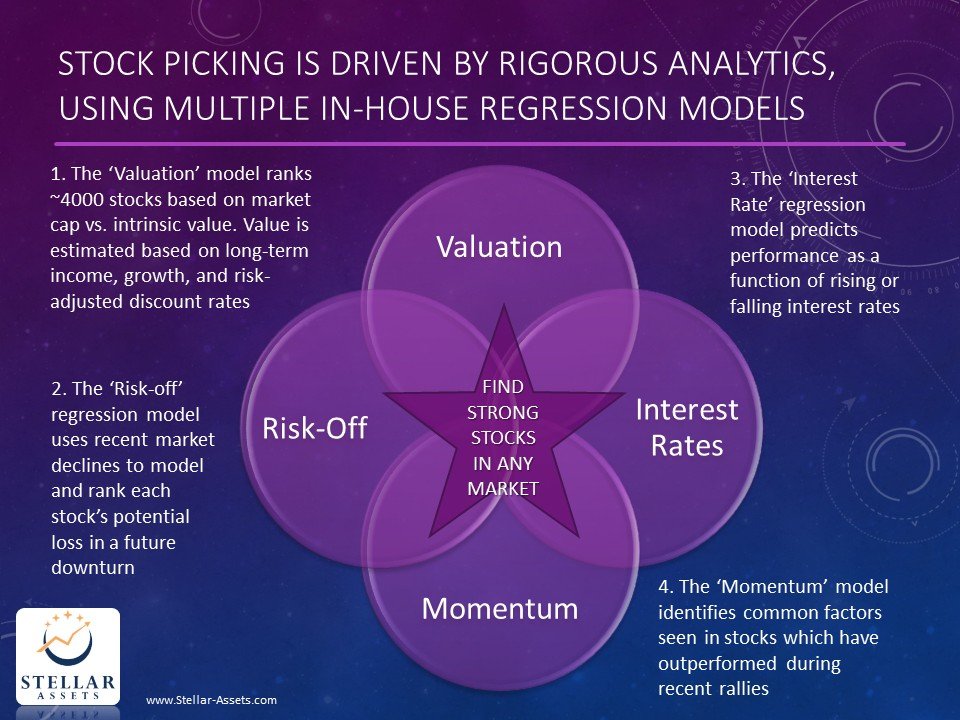 We don’t target average returns. We target superior performance in both up and down markets.. using regression modeling to predict future performance of 3000+ stocks across different market environments. A few of our more important models include: